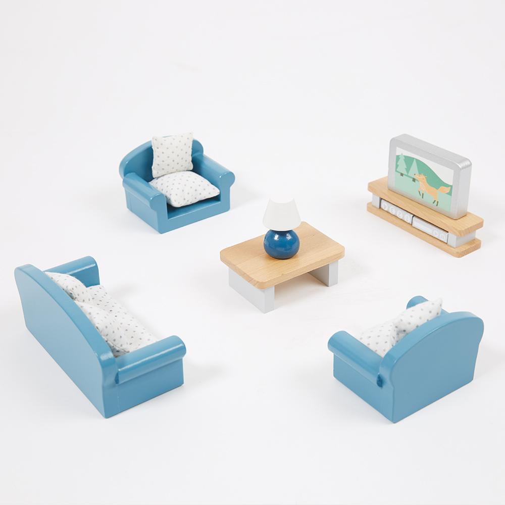 This lovely doll’s house living room furniture set helps to create the perfect place for the residents of your doll’s house to relax. The set includes a sofa and chairs with cushions, a table, a TV, and other accessories as shown. Made from painted wood. Team it up with our Meadow View 360 Wooden Doll’s House or our Large Townhouse Bookcase which cleverly doubles up as a doll’s house. See our other wooden doll’s house furniture sets to transform your house into a home.