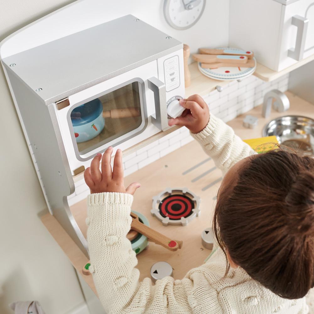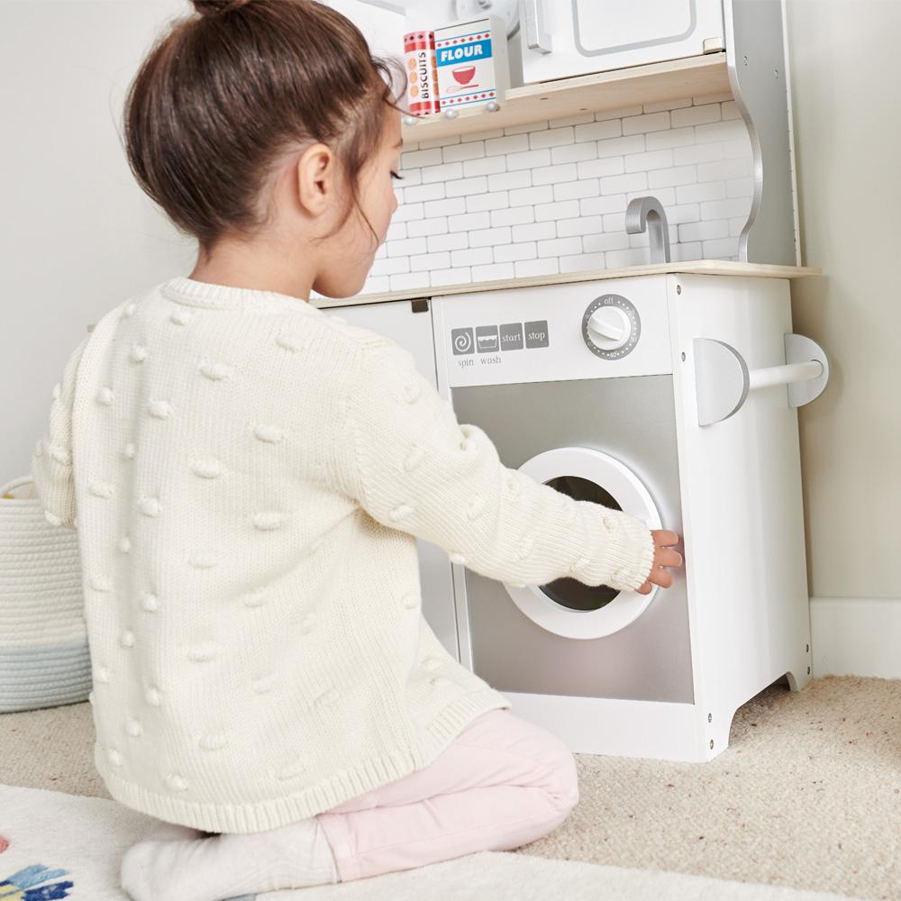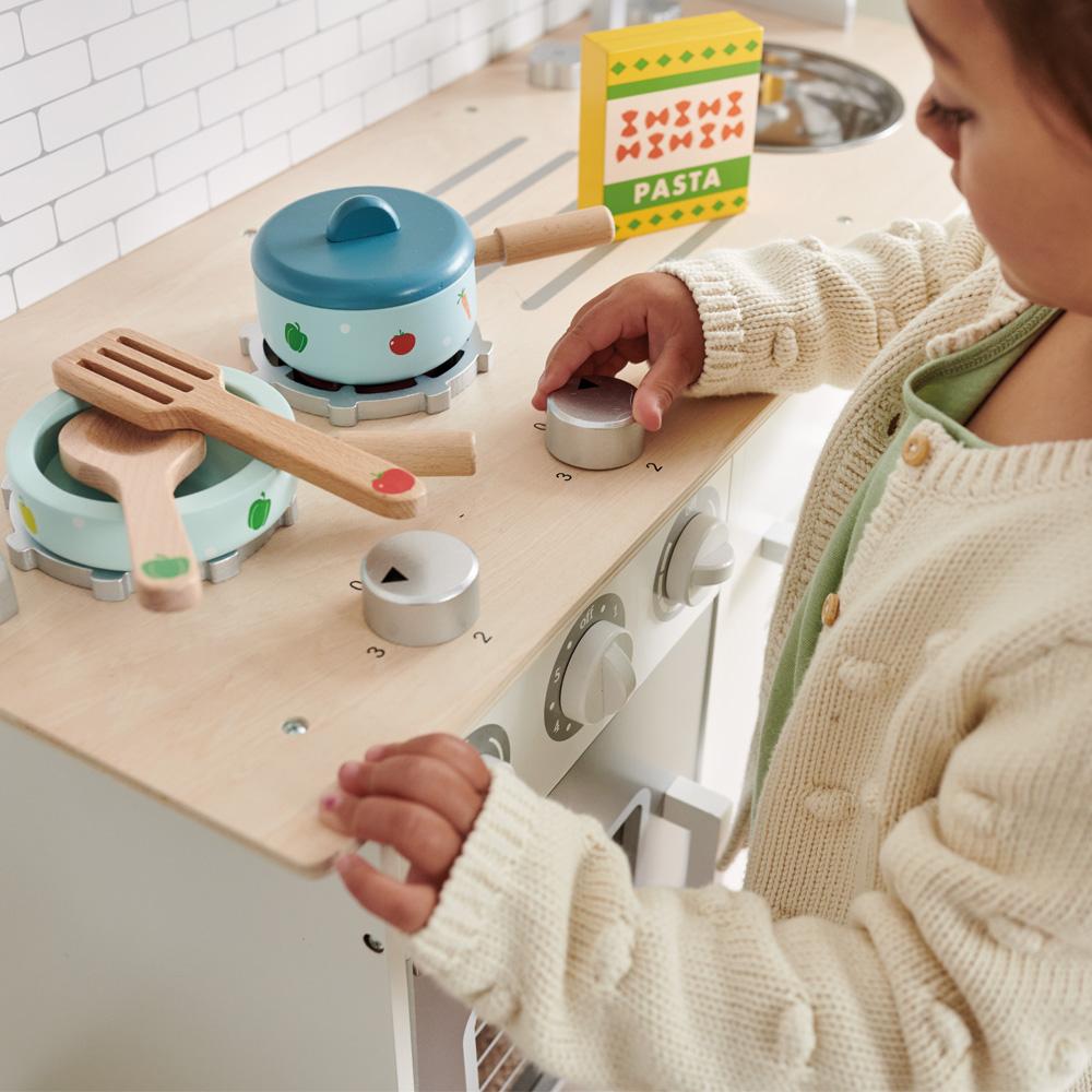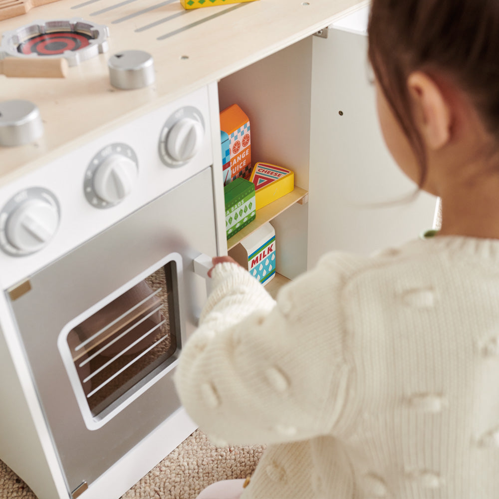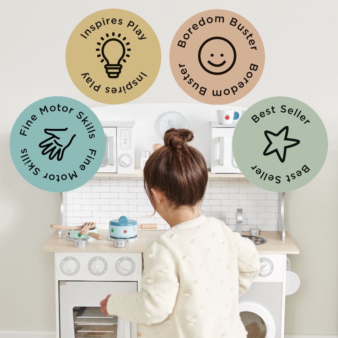 As featured in BBC Good Food’s ‘Best Toy Kitchens’, this lovely play kitchen manages to combine a huge number of features and activities with a helpfully compact size. Children love all the symbols and words our design team have added to the dials; parents love the fact that they’re learning to recognise shapes and words as they play.