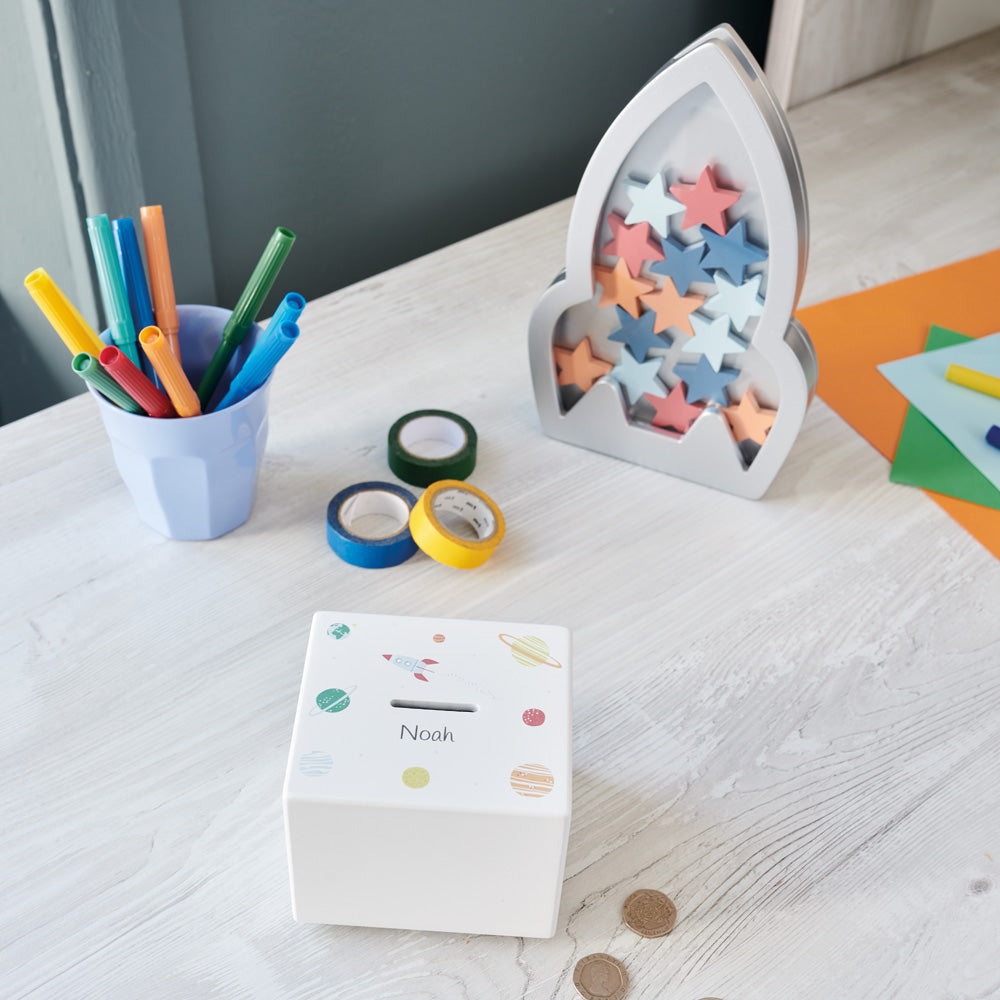 This supersonic reward chart will have children completing chores and doing good deeds in no time. A fun twist on the traditional reward chart; hand your child a colourful star to pop into the rocket every time they’ve been good. When full, it’s treat time! Looking for more space-themed children’s bedroom inspiration? Take a look at our matching Space Explorer Rug.