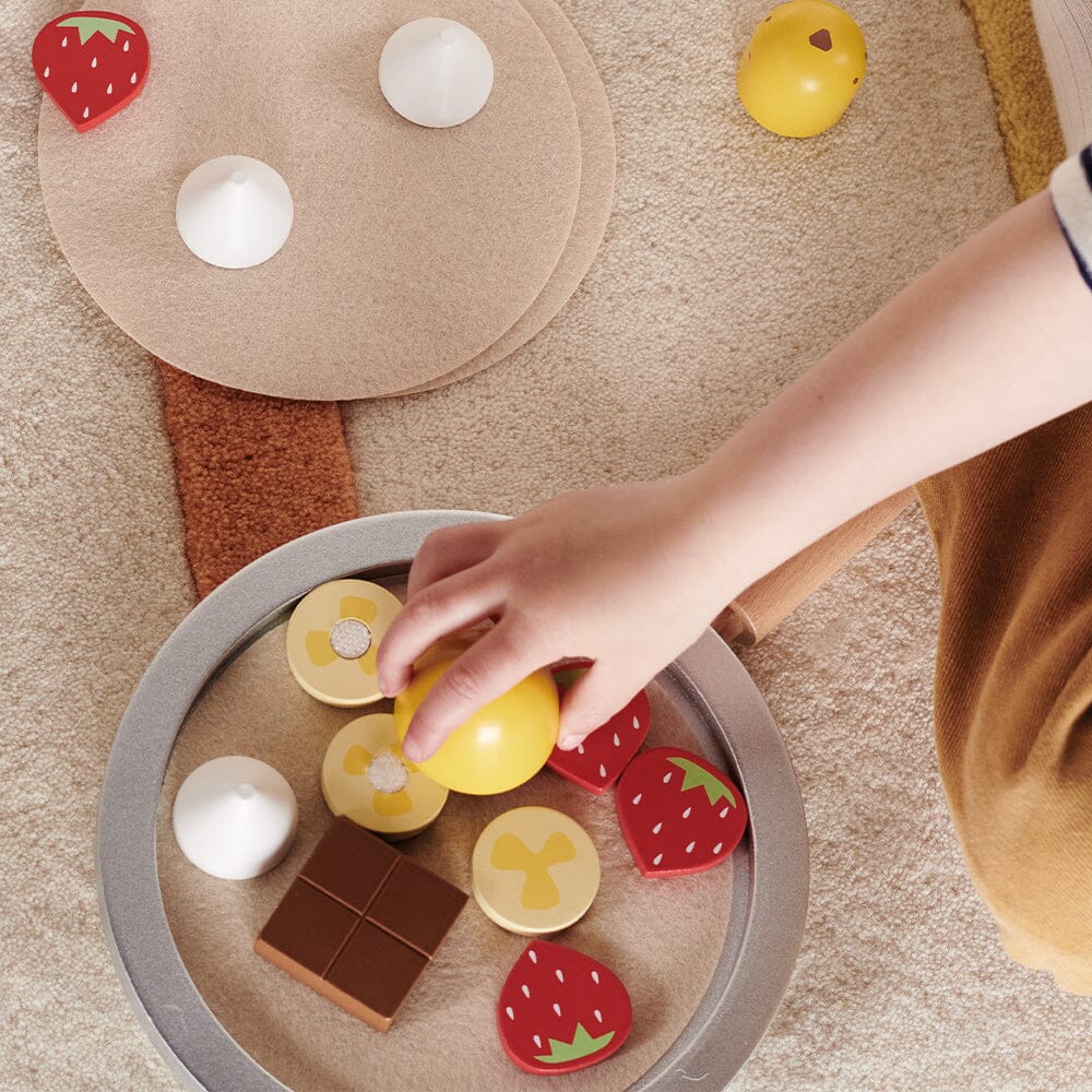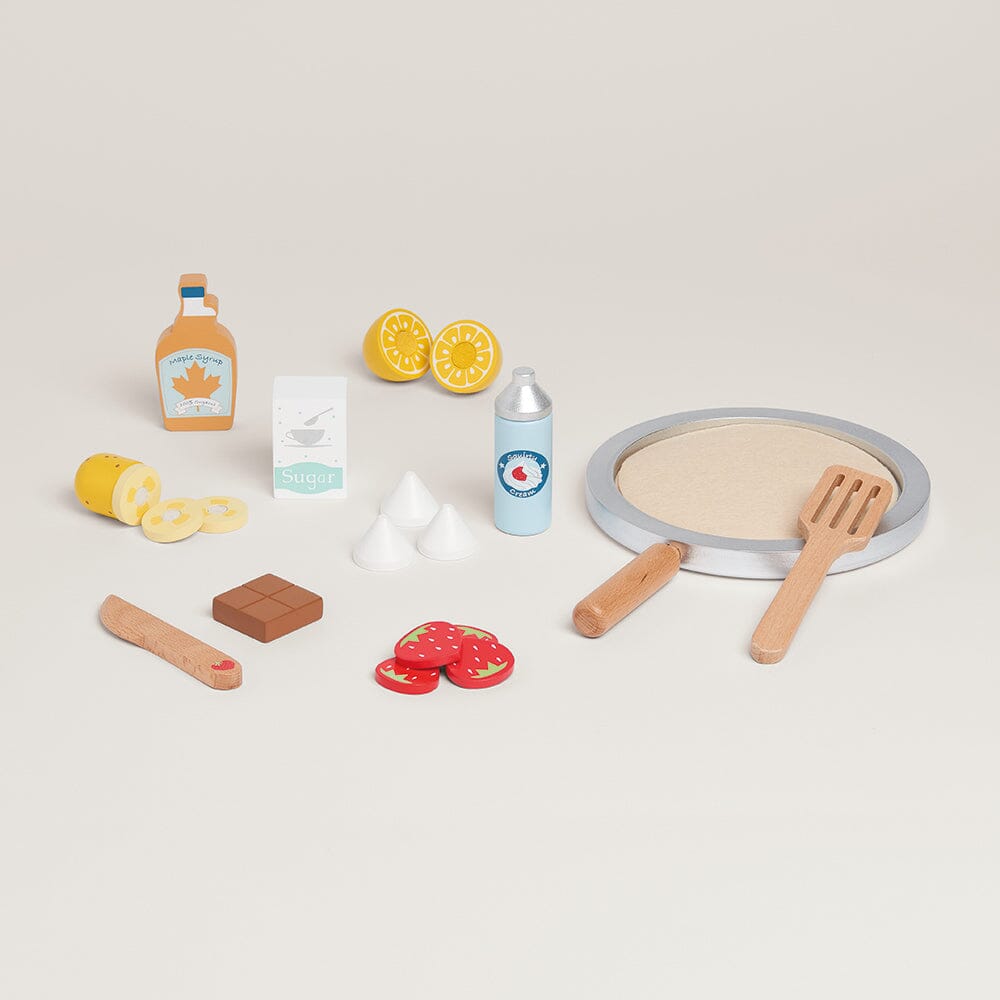 This set includes a whopping 24 accessories including a frying pan, knife, spatula, three pancakes and all the toppings you need to make delicious pancakes: sugar, squirty cream, maple syrup, chocolate, lemon, 3 whipped cream blobs, 4 strawberries and 4 banana slices!