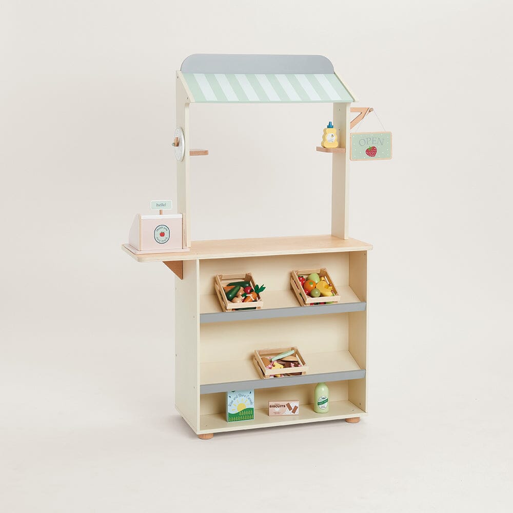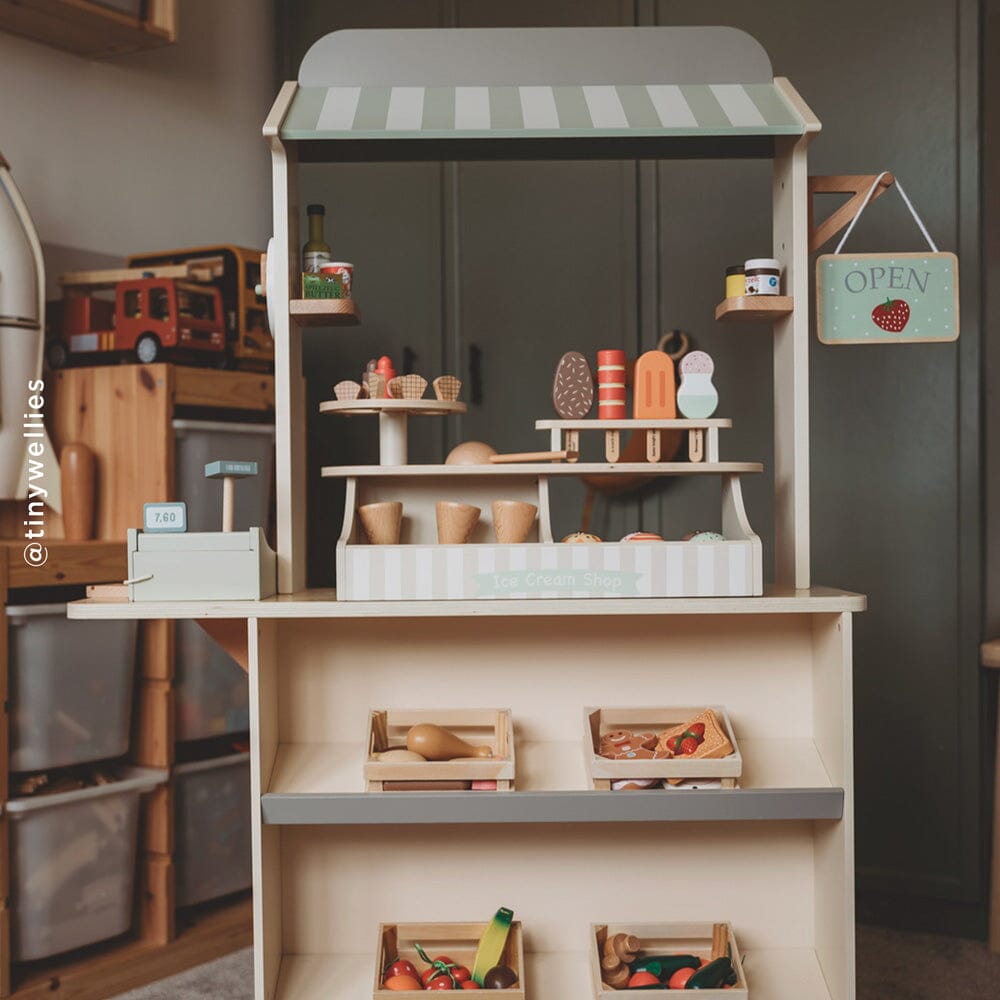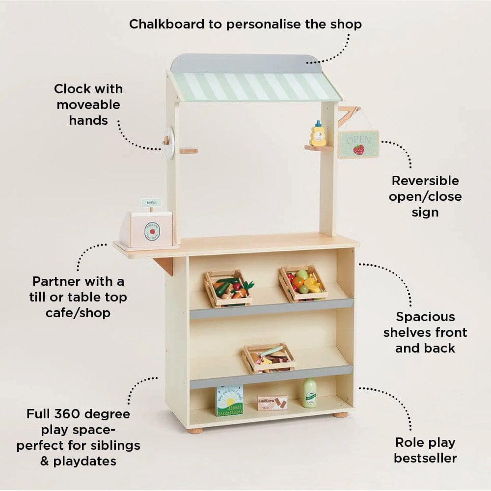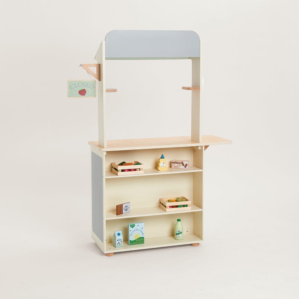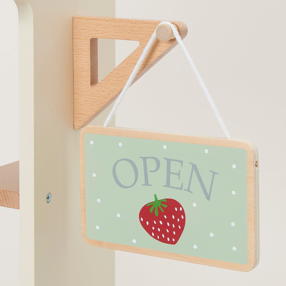 Our wooden play shop is packed with fun features to encourage hours of role play. Whether they serve friends, family or teddy bears, there’s plenty to keep children entertained; from stacking the shelves to writing on the chalkboards, adjusting the time on the clock and using the reversible sign to indicate whether they’re open or closed – busy shopkeepers need to take occasional breaks, after all!