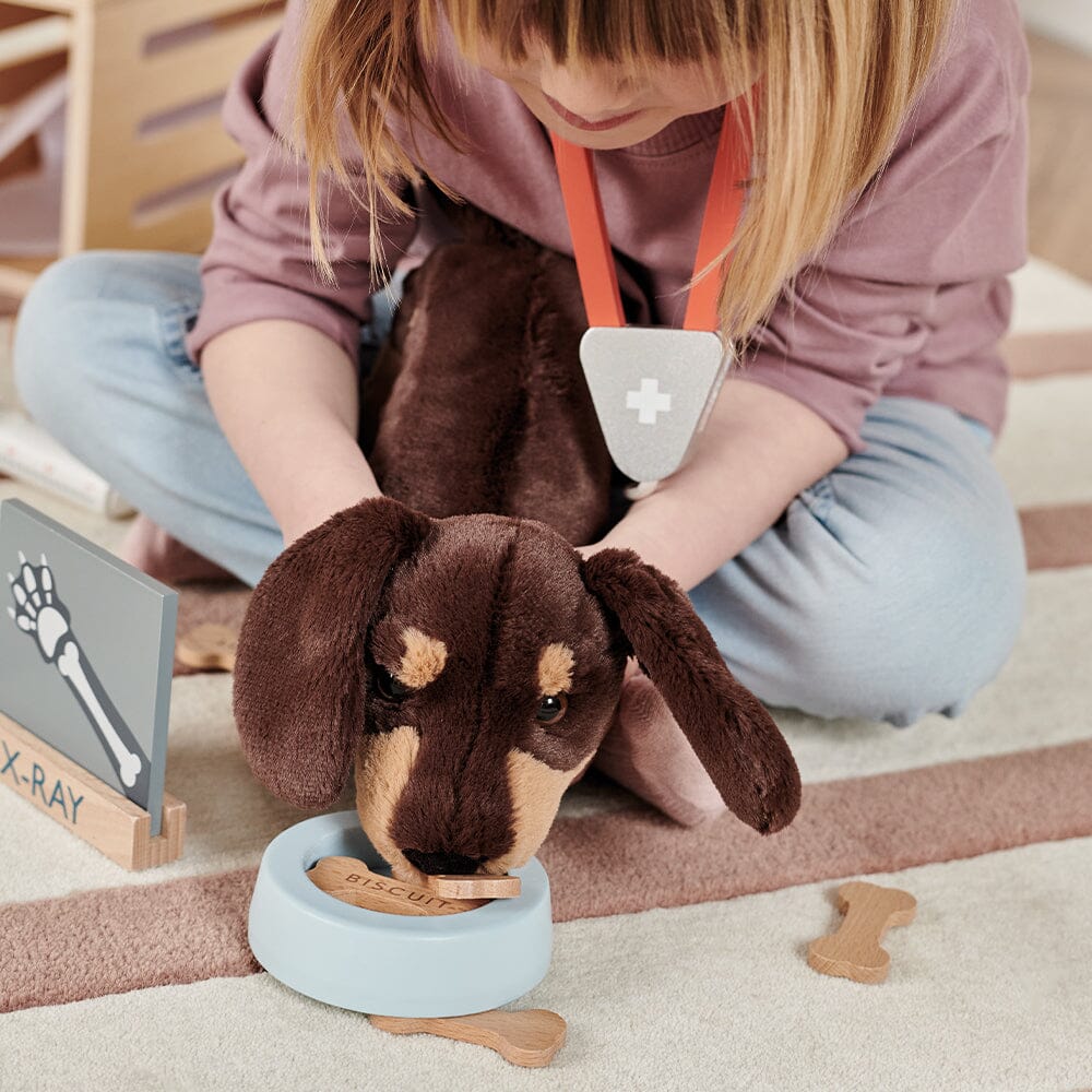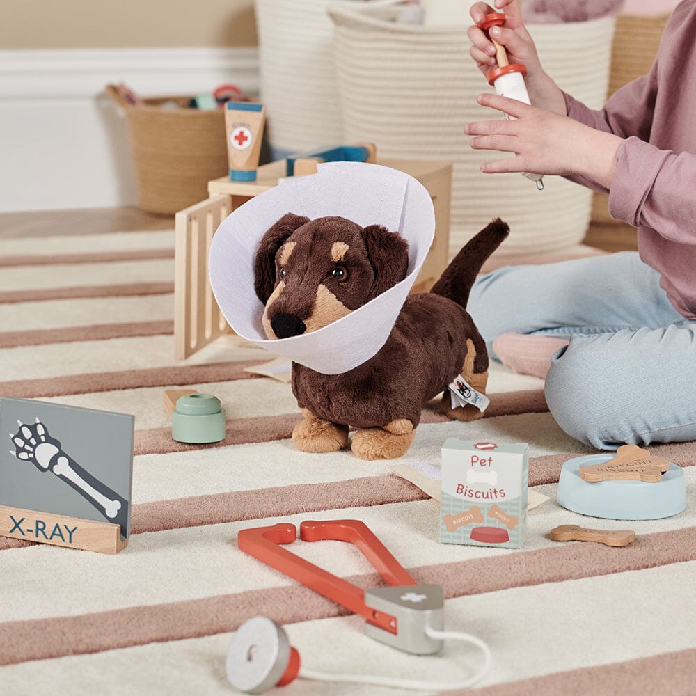 Our Wooden Vet Set is bound to get a big thumbs up from animal lovers; it has everything they need to care for little creatures feeling under the weather.We’ve packed it with 20 accessories including a thermometer, otoscope, stethoscope, syringe, x-ray, cream, a bowl, dog biscuits in a little box, a cone, bandages and a wooden carry to fit all the accessories or their little furry friends.